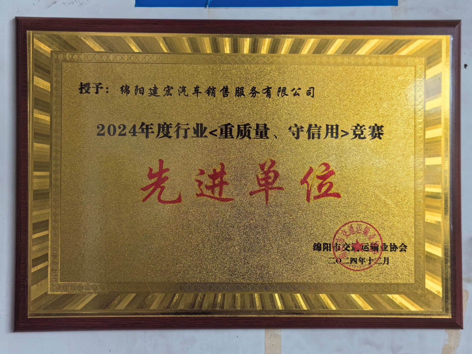 2024年 榮獲綿陽市行業(yè)<重質(zhì)量、守信用>先進(jìn)單位