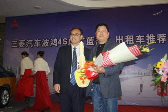 三菱4S店總經(jīng)理劉總與綿陽市區(qū)首臺(tái)藍(lán)瑟出租車用戶斯先生合影