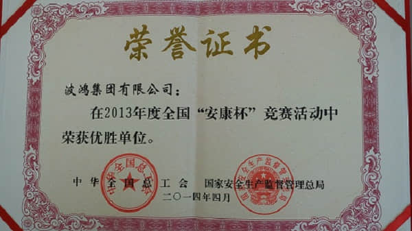 6月18日,中華全國總工會、國家安監(jiān)總局在京召開2013年度全國“安康杯”競賽表彰暨經(jīng)驗交流電視電話會議,對2013年度全國“安康杯”競賽先進集體和優(yōu)秀個人進行了通報表彰。波鴻集團被授予全國“安康杯”競賽優(yōu)勝單位,喜獲殊榮。