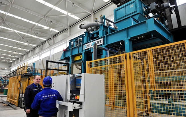 熔爐選用美國進(jìn)口應(yīng)達(dá)感應(yīng)電爐,澆鑄機(jī)選用日本新東FVN—Ⅲ傾斜式全自動(dòng)澆注機(jī)和韓國康英斯全自動(dòng)底注式澆注機(jī),制芯采用德國進(jìn)口蘭佩制芯中心,清洗選用丹麥DISA和意大利潘邦拋丸機(jī),整個(gè)環(huán)節(jié)下來,僅設(shè)備的投入達(dá)到5.8億元。