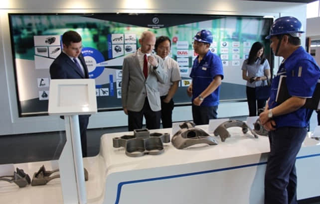 在鑄造生產(chǎn)車(chē)間,好圣公司總經(jīng)理助理趙總向羅瀾一行著重介紹了目前屬世界一流的好圣汽車(chē)發(fā)動(dòng)機(jī)關(guān)鍵零部件精密鑄件制造數(shù)字化車(chē)間項(xiàng)目情況及產(chǎn)品技術(shù),并帶領(lǐng)參觀了德國(guó) HWS造型線和德國(guó)KW生產(chǎn)線,丹麥DISA造型生產(chǎn)線和日本新東造型生產(chǎn)線、后處理、質(zhì)量檢測(cè)線??傤I(lǐng)事羅瀾一行對(duì)好圣公司先進(jìn)的技術(shù)工藝及生產(chǎn)自動(dòng)化程度予以大力贊揚(yáng)。