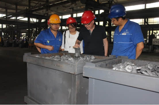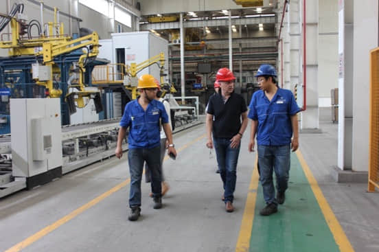 在鑄造生產(chǎn)車間,副總經(jīng)理趙紅利向Mario著重介紹了擁有全球最好裝備設(shè)備,單體面積達(dá)到5.4萬平方米的全球最大單體鑄造車間。Mario一行重點參觀了德國KW水平有箱多觸頭靜壓造型線、德國HWS水平有箱多觸頭靜壓造型線,丹麥DISA造型生產(chǎn)線和日本新東造型生產(chǎn)線,并對好圣先進(jìn)的技術(shù)生產(chǎn)能力表示贊揚。