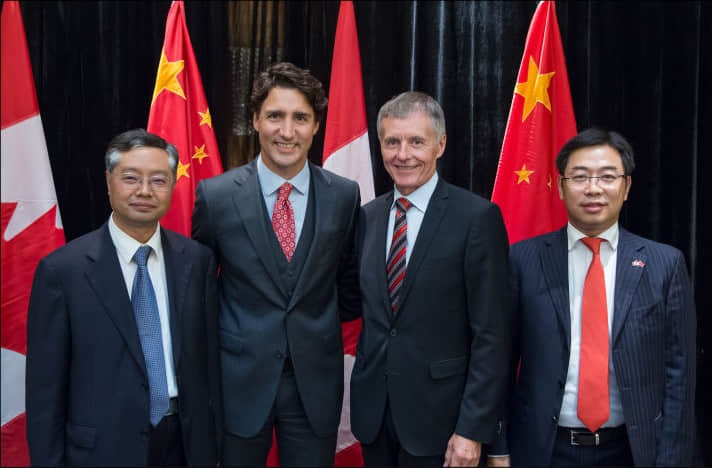 波鴻集團(tuán)董事長(zhǎng)董平(右一)與加拿大總理特魯多(左二)及嘉賓交流并合影
