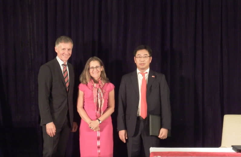 波鴻集團(tuán)董事長(zhǎng)董平(右一)、加拿大國(guó)際貿(mào)易部長(zhǎng)弗里蘭(中)、溫莎大學(xué)校長(zhǎng)韋德曼(左一)
