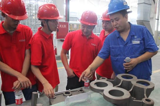 隨后,在好圣公司造型科王克宣科長的帶領(lǐng)下,實踐小組先后參觀了好圣一廠、二廠和波鴻集團展廳。在車間,同學們見到了代表全球鑄造業(yè)高端一流生產(chǎn)設(shè)備的美國應達中頻感應熔煉系統(tǒng)、德國KW水平有箱多觸頭靜壓造型線、德國HWS水平有箱多觸頭靜壓造型線、德國愛立許混砂系統(tǒng)、丹麥DISA造型生產(chǎn)線和日本新東造型生產(chǎn)線,現(xiàn)場體會到了好圣公司的6S管理;在波鴻展廳,講解員引領(lǐng)大家回顧了波鴻發(fā)展歷程,了解了波鴻集團的組織架構(gòu)、全球產(chǎn)業(yè)布局以及三大事業(yè)部主要產(chǎn)品。
