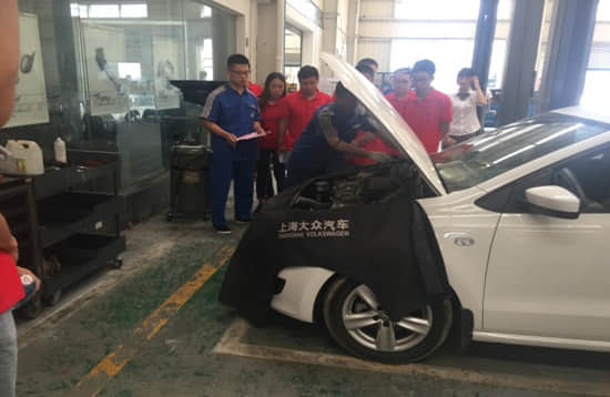 進(jìn)入保養(yǎng)維修車間,同學(xué)們被一流的檢測檢修設(shè)備所吸引,這里秩序井然,熟練的技工師傅正進(jìn)行流水線作業(yè);在全程保養(yǎng)可視化操作線旁,同學(xué)們駐足觀摩維修技工師傅的現(xiàn)場操作,久久不愿離開。