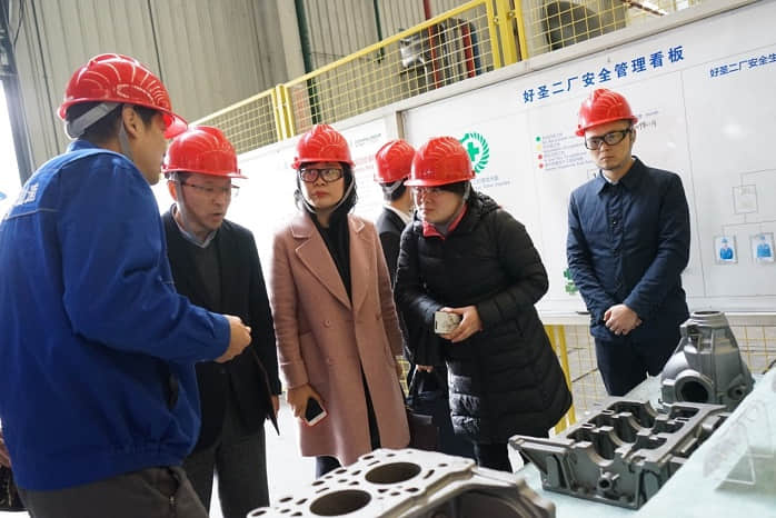 在波鴻實(shí)業(yè)總經(jīng)理李赤波陪同下,調(diào)研組一行先來到好圣公司二廠鑄造車間實(shí)地參觀。工廠負(fù)責(zé)人趙紅利向客人一 一介紹了工廠的熔煉系統(tǒng)、KW和HWS造型線等生產(chǎn)關(guān)鍵設(shè)備和生產(chǎn)工藝流程,以及汽車發(fā)動機(jī)缸體、缸蓋、變速箱殼體、輪轂、制動鼓、平衡軸支架、排氣歧管等產(chǎn)品。