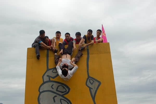 最后一個(gè)項(xiàng)目叫深海逃生也叫畢業(yè)墻。就是不能借助任何工具和外力,我們?nèi)w成員在最短的時(shí)間里翻越8--9米的高墻,就算全體畢業(yè)。因?yàn)闀r(shí)間的緊迫,我們的男隊(duì)友一個(gè)個(gè)自覺(jué)的搭成人字梯,先讓體重大,年齡大,我們女生先上,在我們共同的努力下我們以優(yōu)異的成績(jī)完成了最后一項(xiàng)任務(wù)(18分鐘)。當(dāng)我們?nèi)w站在畢業(yè)墻上歡呼的那一刻,看著下面的戰(zhàn)友手磨破了,肩膀也滲出了血跡,我知道了什么是勇敢,什么是奉獻(xiàn),什么是大無(wú)畏精神,使我想起了一首歌是這樣唱的:“一要筷子輕輕被折斷,十根筷子牢牢抱成團(tuán)”我們?yōu)槟切└蕿槿颂荩瑸樗麄兊挠赂?,奉獻(xiàn)鼓掌,感謝他們,沒(méi)有大家的共同配合,我們最終不可能完成任務(wù)!