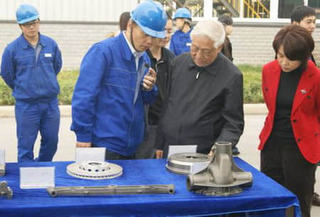 鄭老一行在六號(hào)鑄造車間外聽取了制造事業(yè)部副總宋榕輝關(guān)于好圣基本情況和發(fā)展規(guī)劃的匯報(bào),并就好圣主要生產(chǎn)設(shè)備、產(chǎn)品做了介紹。并進(jìn)入鑄造車間參觀了生產(chǎn)線工藝流程。鄭老對(duì)好圣擁有全球領(lǐng)先的生產(chǎn)設(shè)備感到無比欣慰,充分肯定了好圣的發(fā)展前景,并對(duì)我公司的發(fā)展規(guī)劃充滿了信心。同時(shí)有針對(duì)性的對(duì)熔煉、造型、澆注等重要生產(chǎn)環(huán)節(jié)提出了寶貴意見,指出我們不能僅擁有世界領(lǐng)先的生產(chǎn)設(shè)備,更要擁有屬于自己的先進(jìn)生產(chǎn)技術(shù),著重培養(yǎng)自己的人才隊(duì)伍,只有通過不斷提升自身的技術(shù)水平才能夠打出重拳、打出亮拳。
